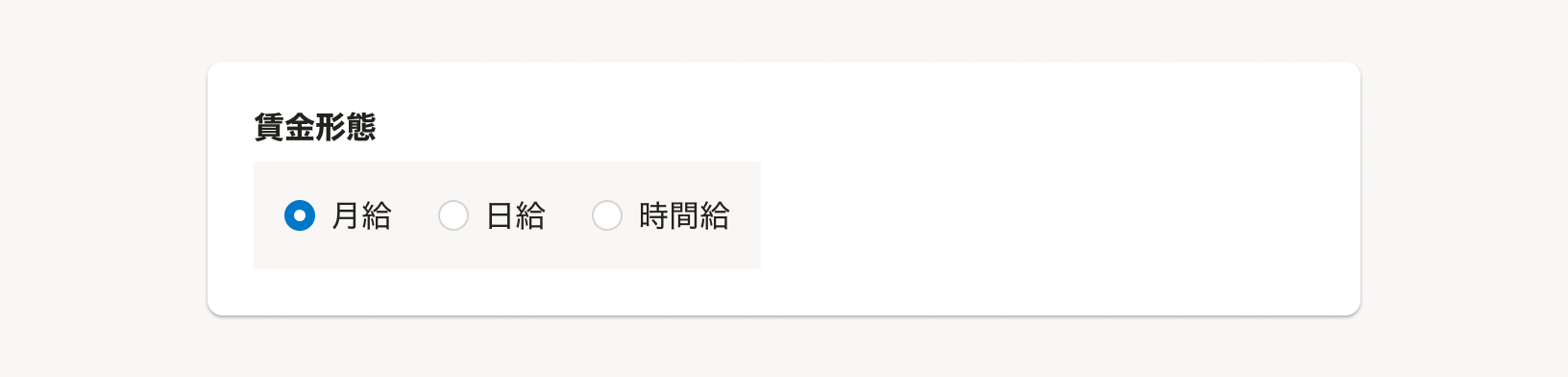 ラジオボタンのラベルテキストは、同程度の文量や行数になるように調整してください。 ラジオボタンは性質上、テキストの文量によって幅が変化します。極端に行数や文量の異なる選択肢が混ざると、ユーザーが視認できる領域の差異が大きくなるため、選択肢を間違える恐れがあります。