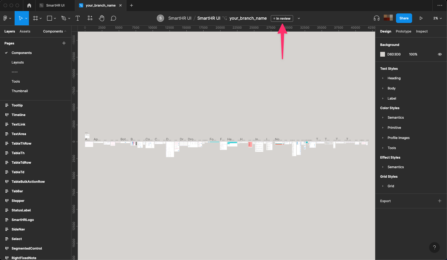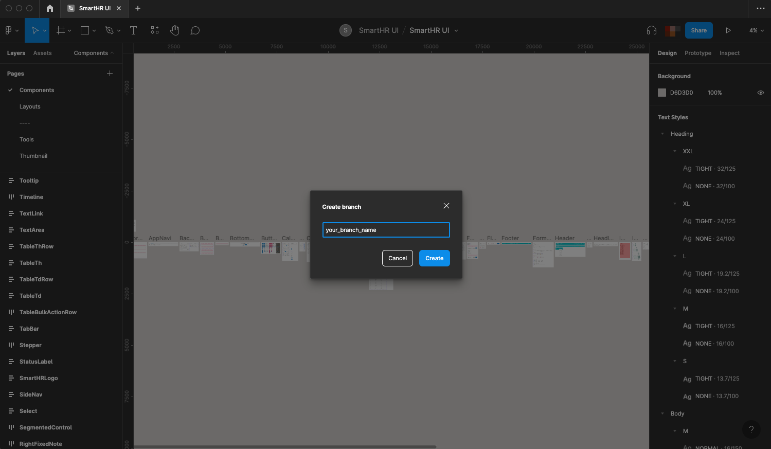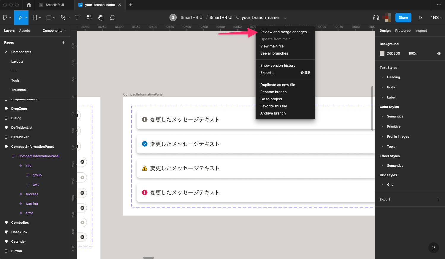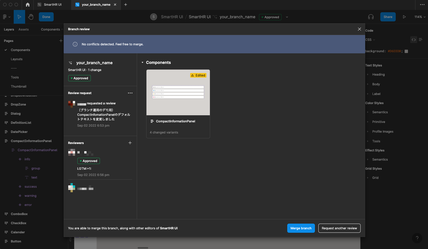 SmartHR UIに変更を加える場合は、Figmaの「ブランチ機能」を利用してレビューを依頼する必要があります。 ブランチ作成時やレビュー依頼時は、以下の点に注意して作業してください。