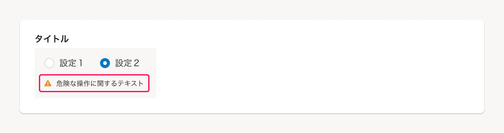 影響する範囲が複雑な場合など特殊な条件が含まれる設定項目には、警告 アイコン(FaTriangleExclamationIcon)と補足テキストを設定項目の下部に表示しユーザーに注意を促すことで、意図しない選択状態になることを防ぎます。
