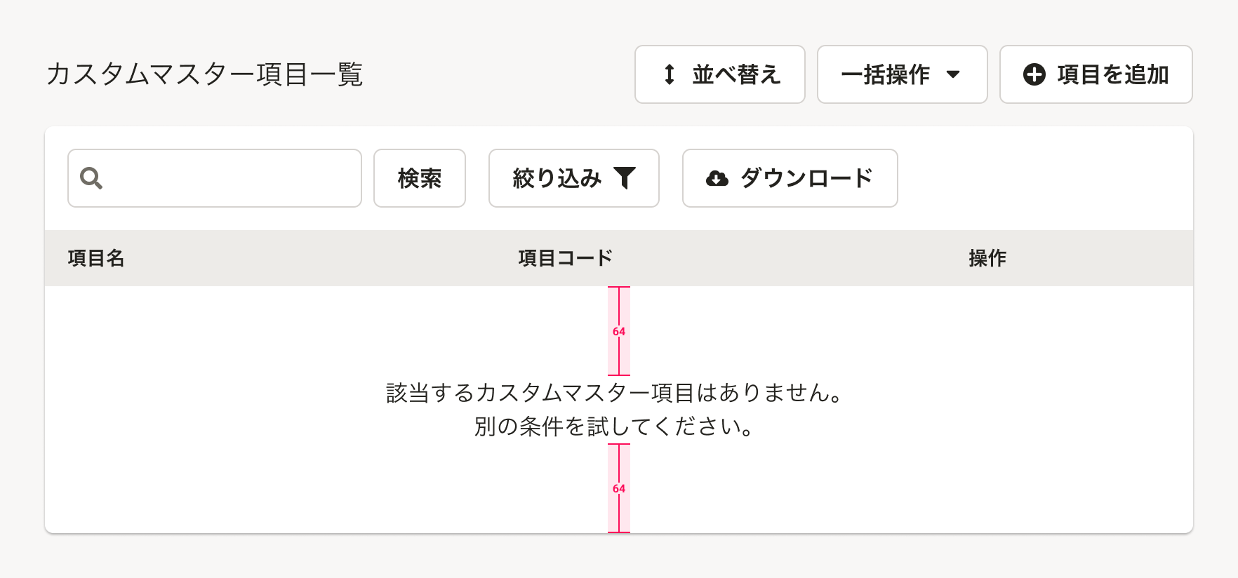 Base内部に、{オブジェクト名}はありません。というメッセージと、オブジェクト追加を促すボタンを上下左右中央に表示します。- オブジェクト追加を促すボタンは、基本的にSecondaryボタンのサイズ小を使います。